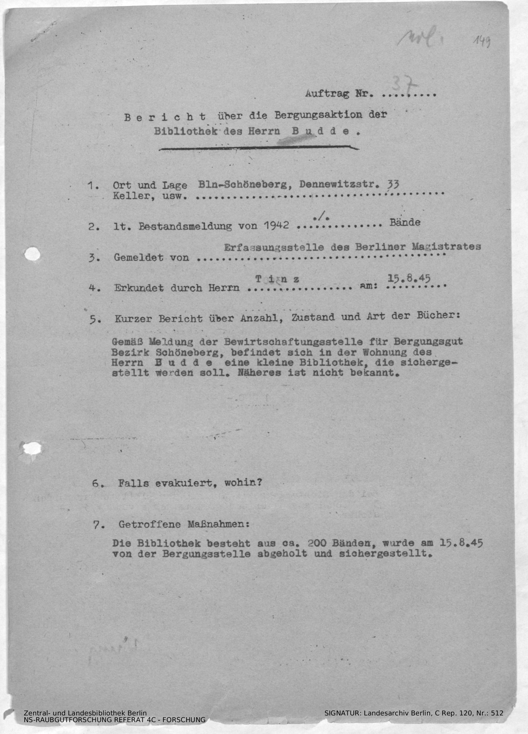Bericht über die Bergungsaktion der Bibliothek des Herrn Budde