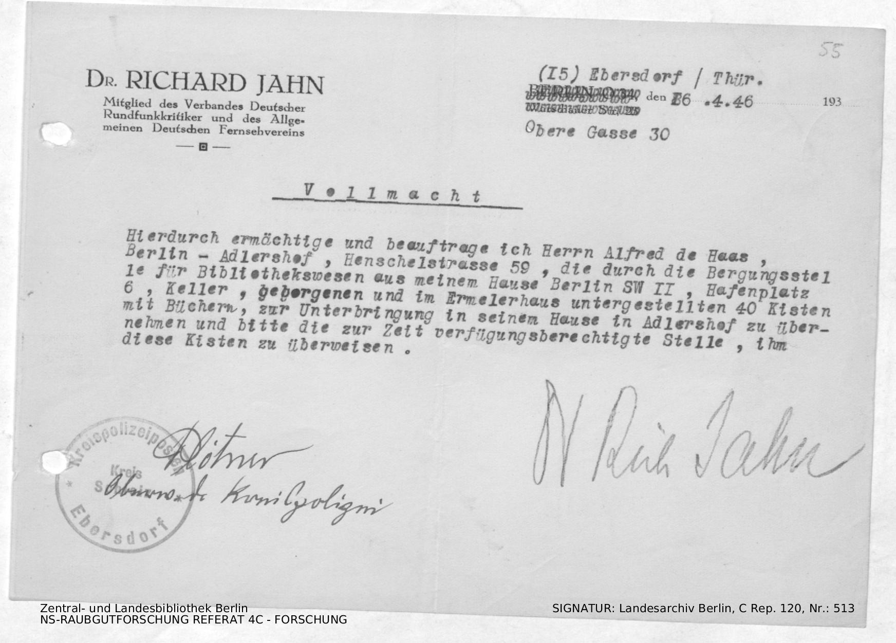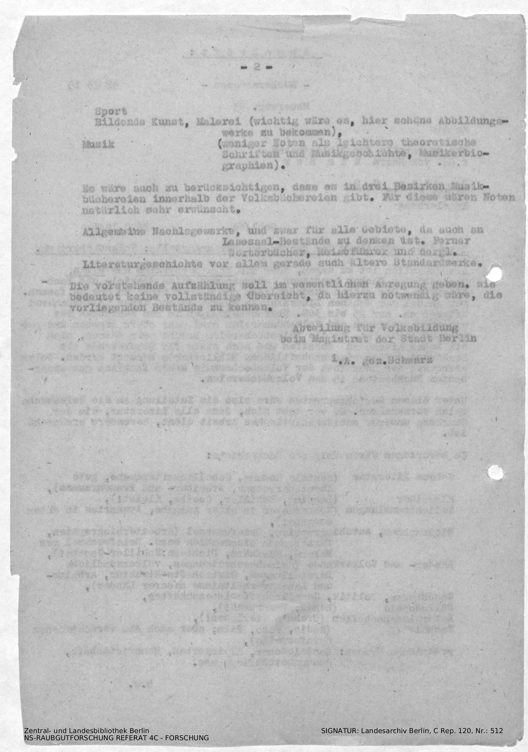 Weitere Sichtung soll durch Geheimes Staatsarchiv erfolgen und faschistische Literatur eingestampft werden.