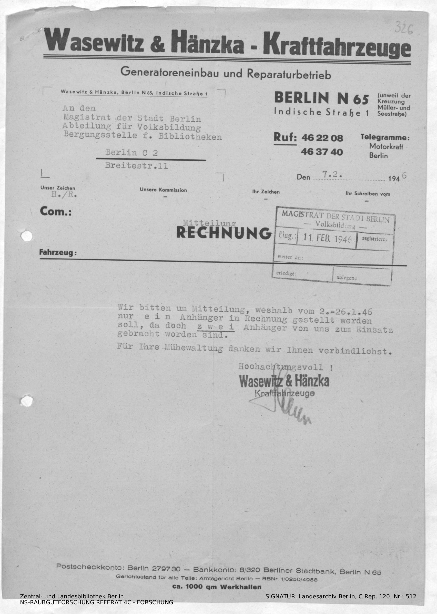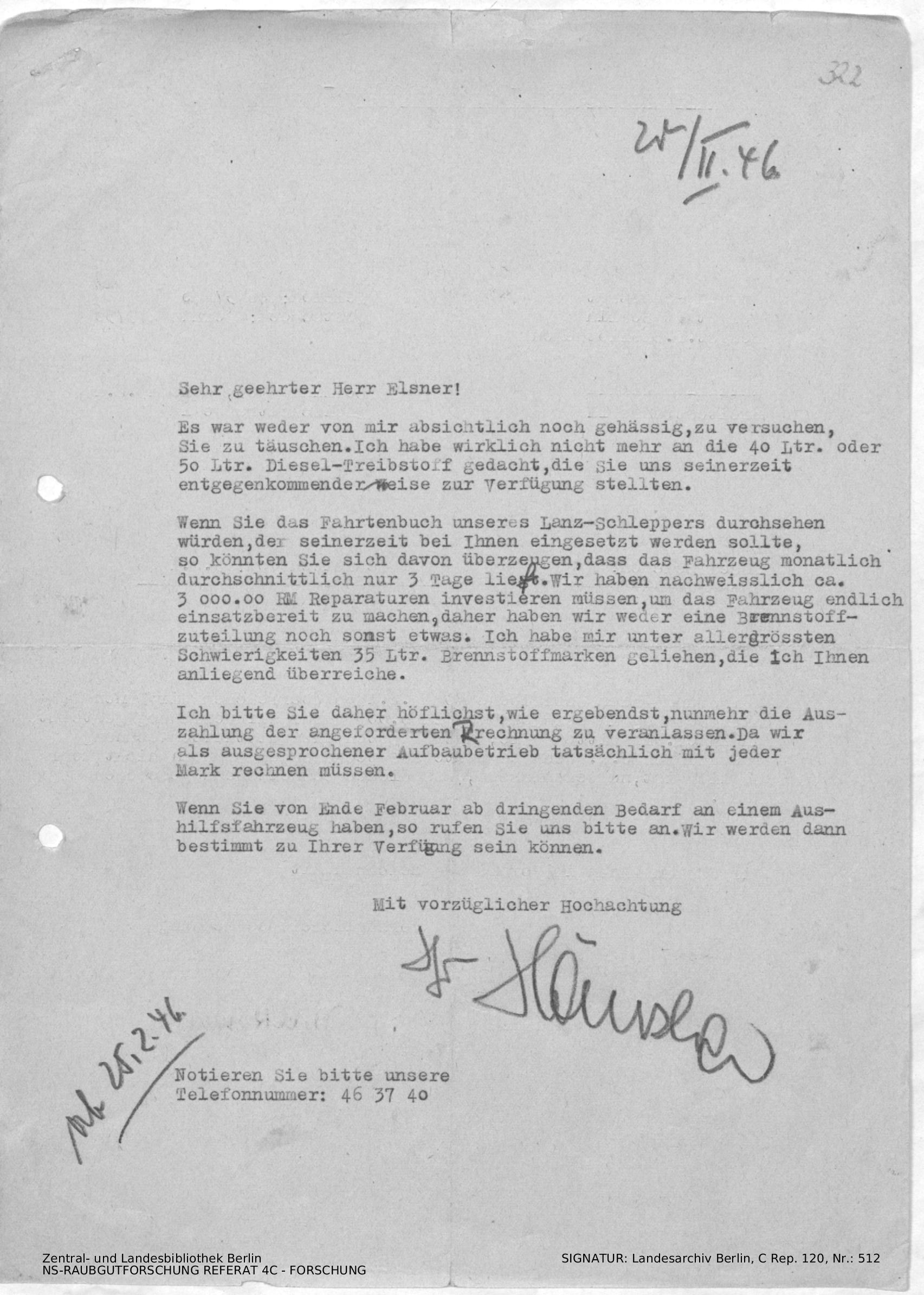 Schriftwechsel zu Treibstoff, Lastwagen und Anhänger für Transporte im Auftrag der Bergungstelle bzw. des Magistrats von Berlin. Preise und Angebot zur Altpapierentsorgung.