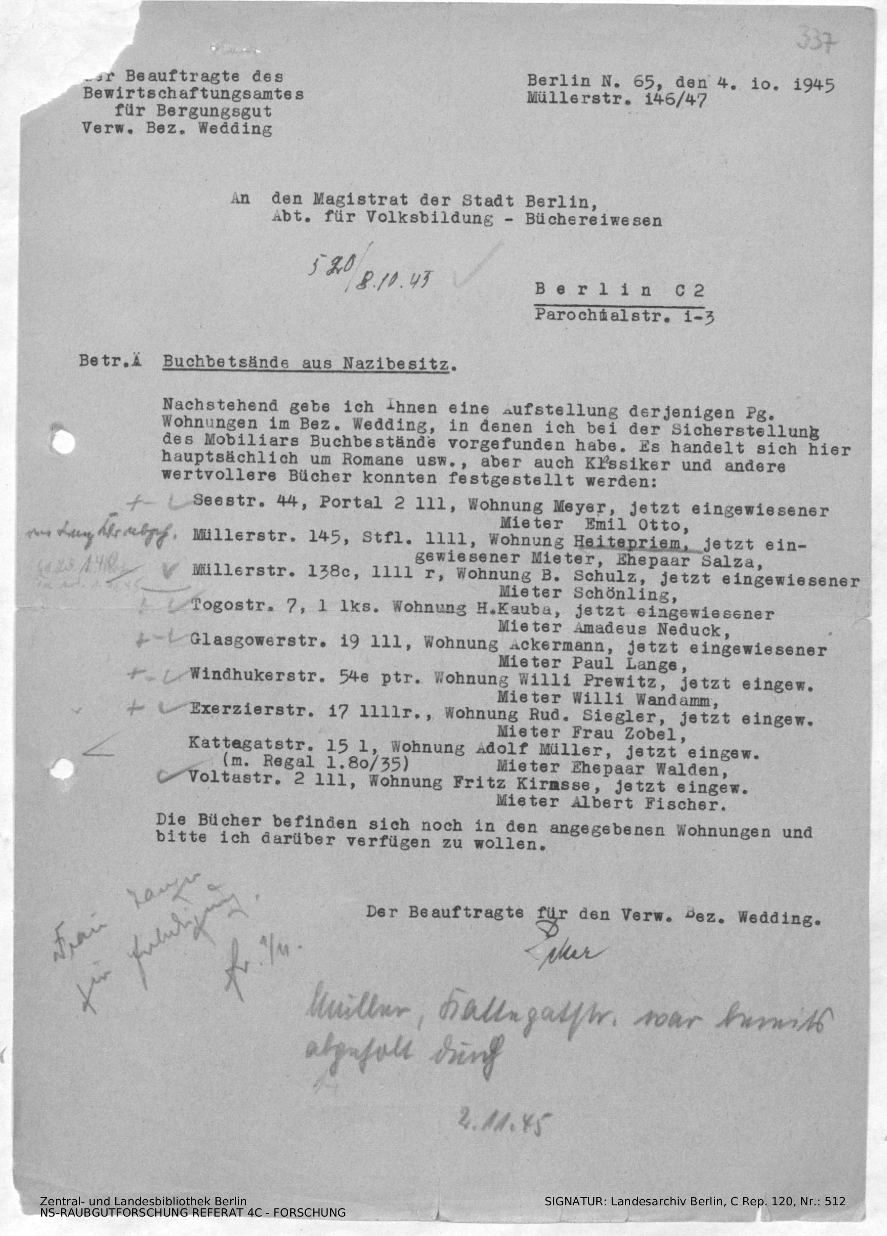 Schriftwechsel zu Buchbeständen aus Privatwohnungen in Wedding