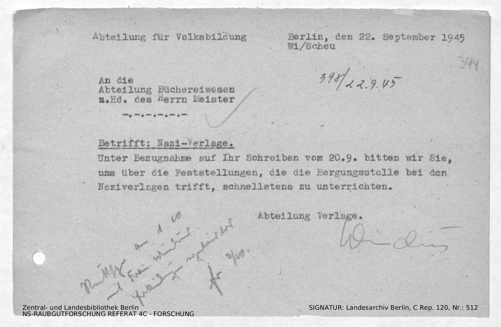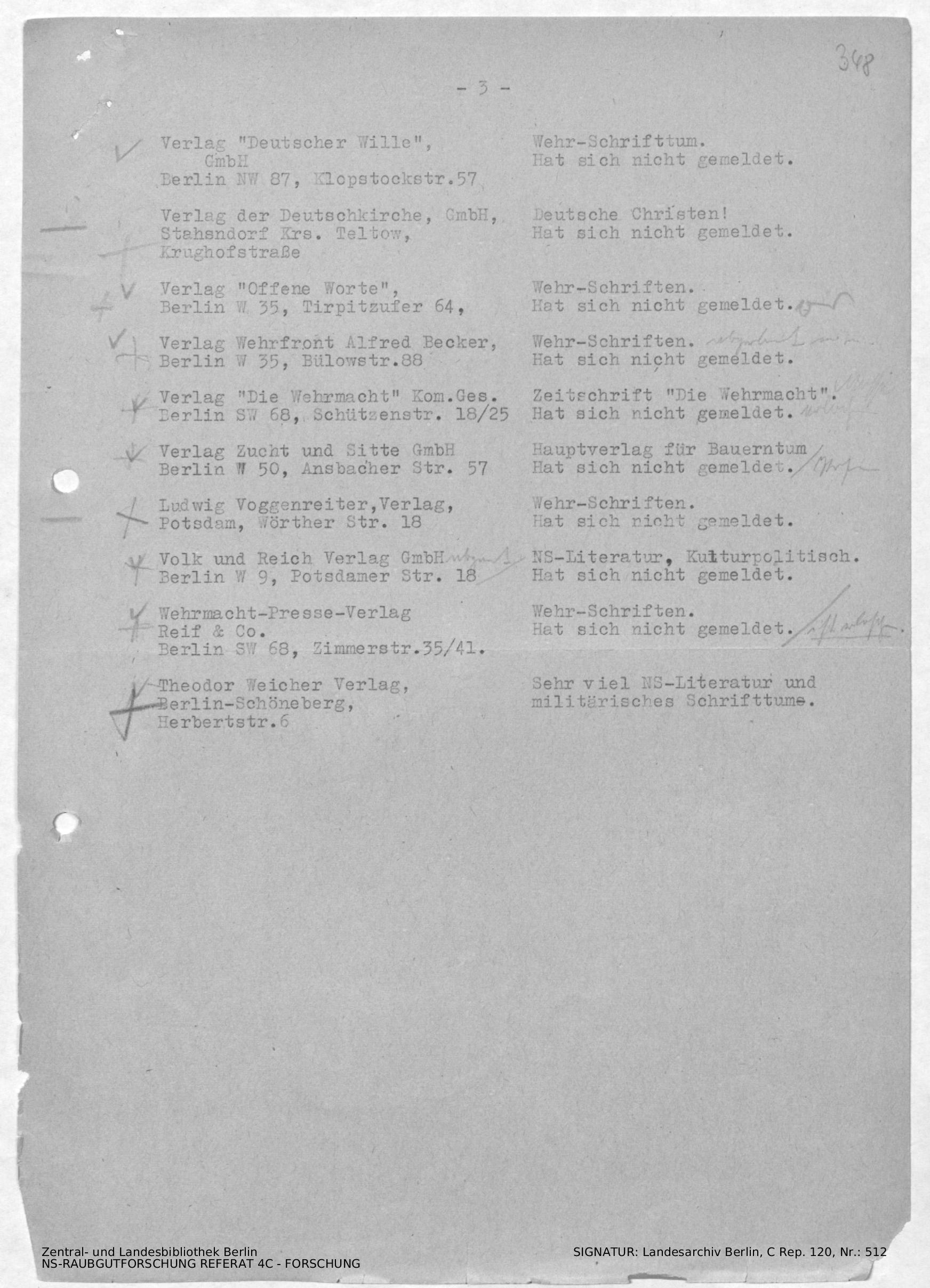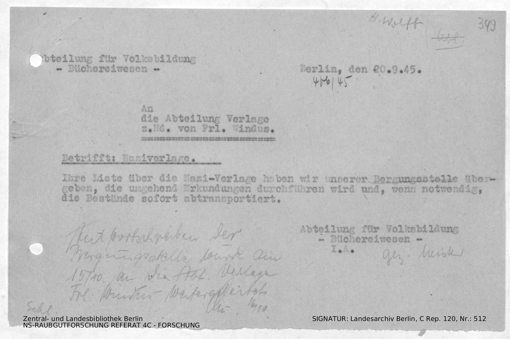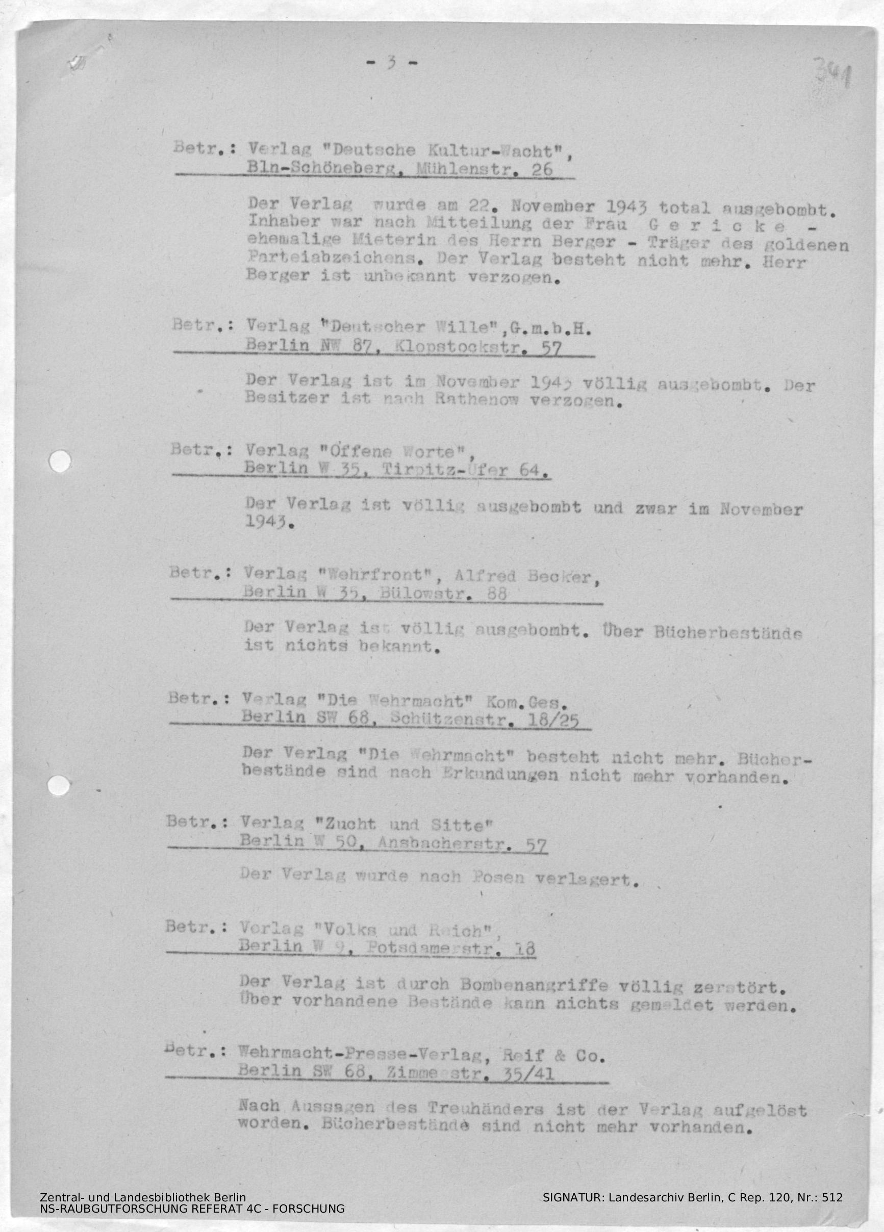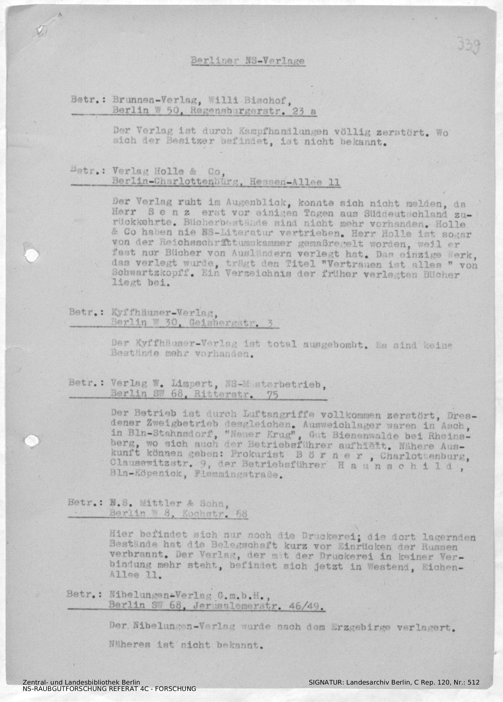 Übergabe einer Liste von Berliner Verlagen, die "vorwiegend NS- und militärisches Schrifttum herausgegeben haben". Kurzberichte der Bergungstelle nach Erkundung der Verlage.