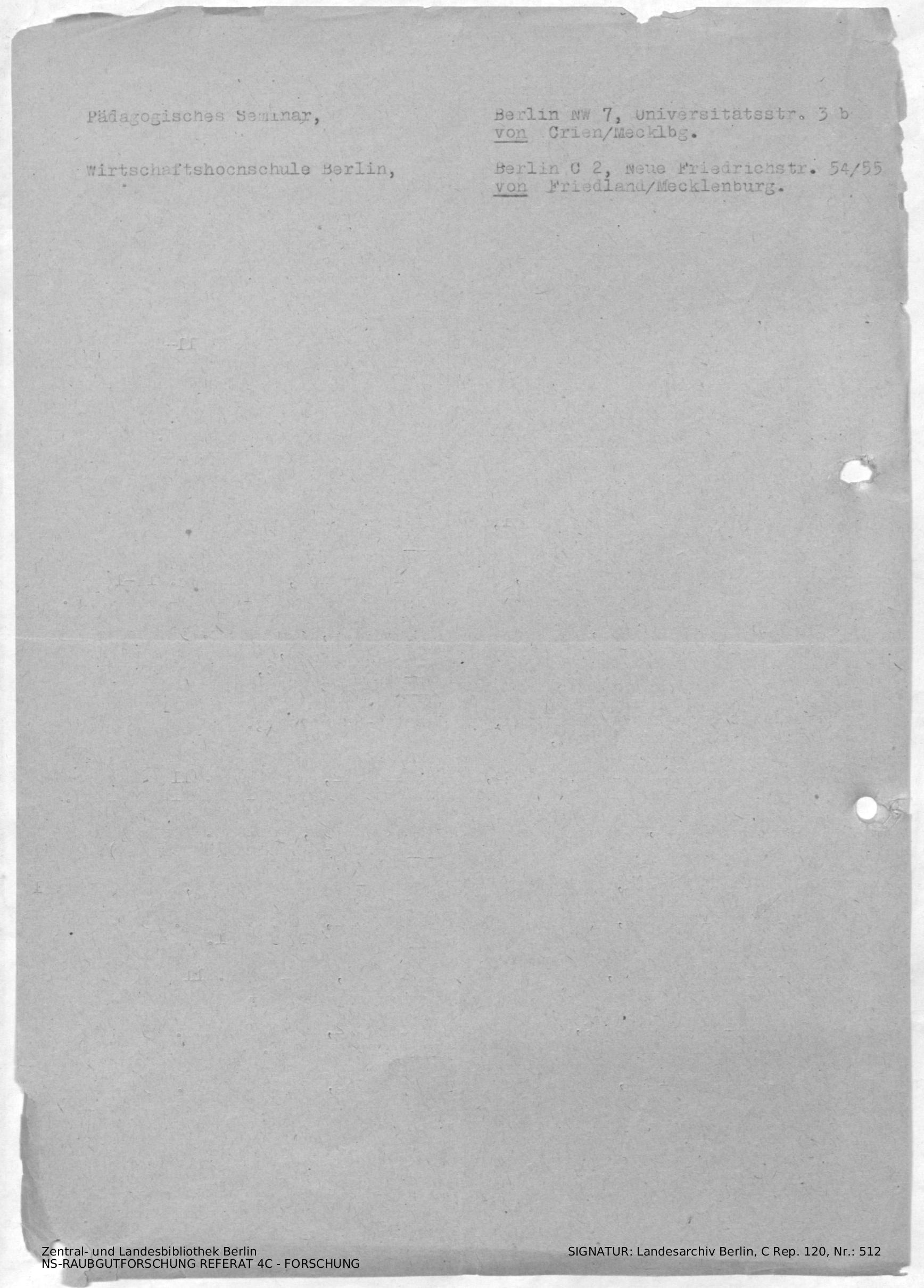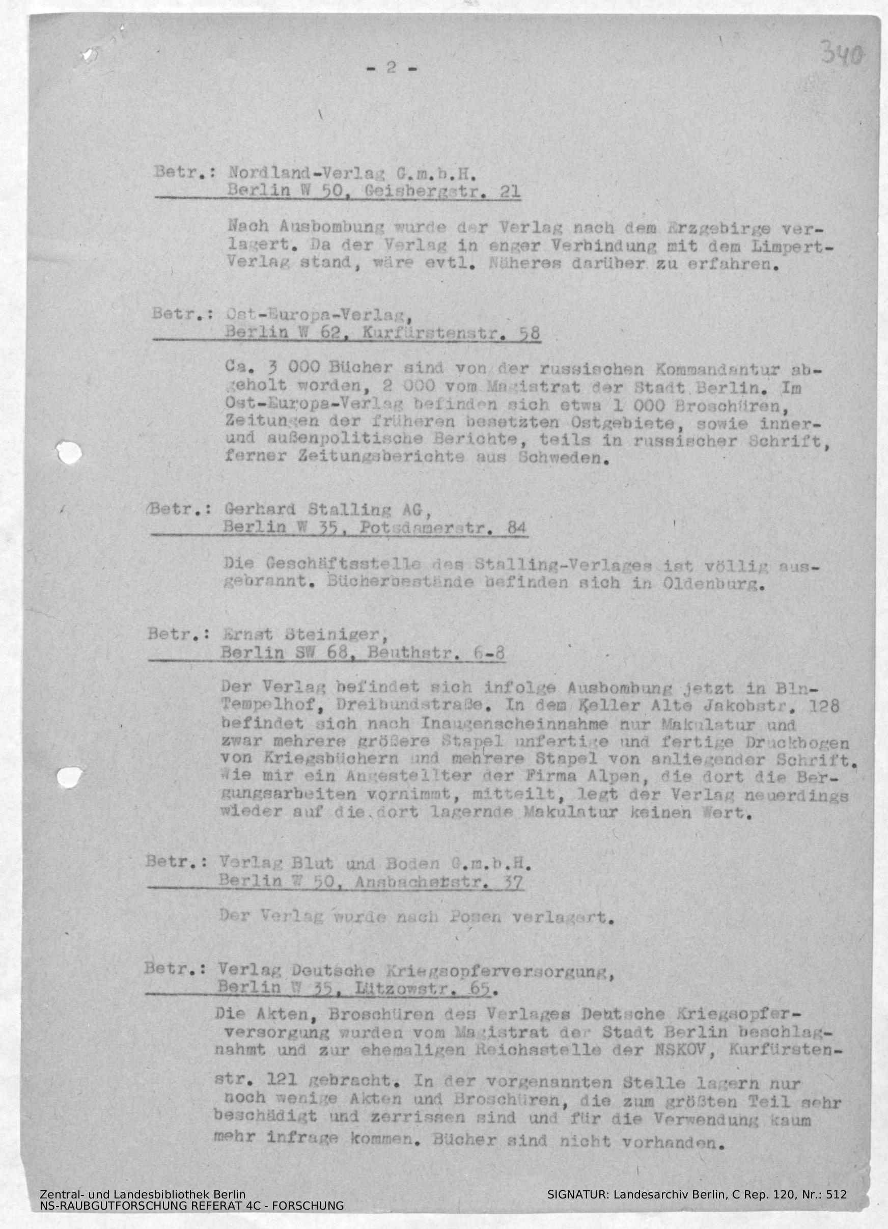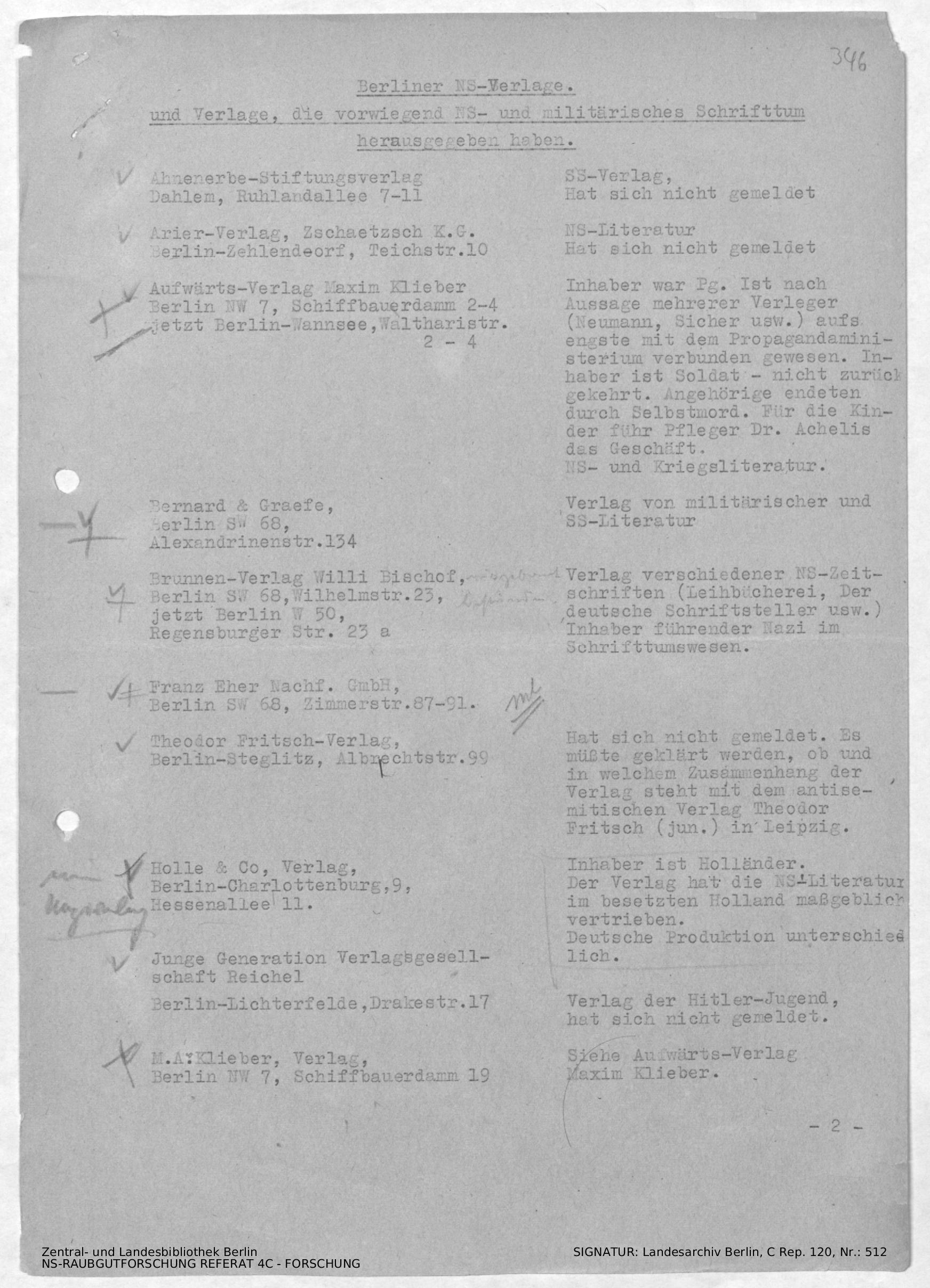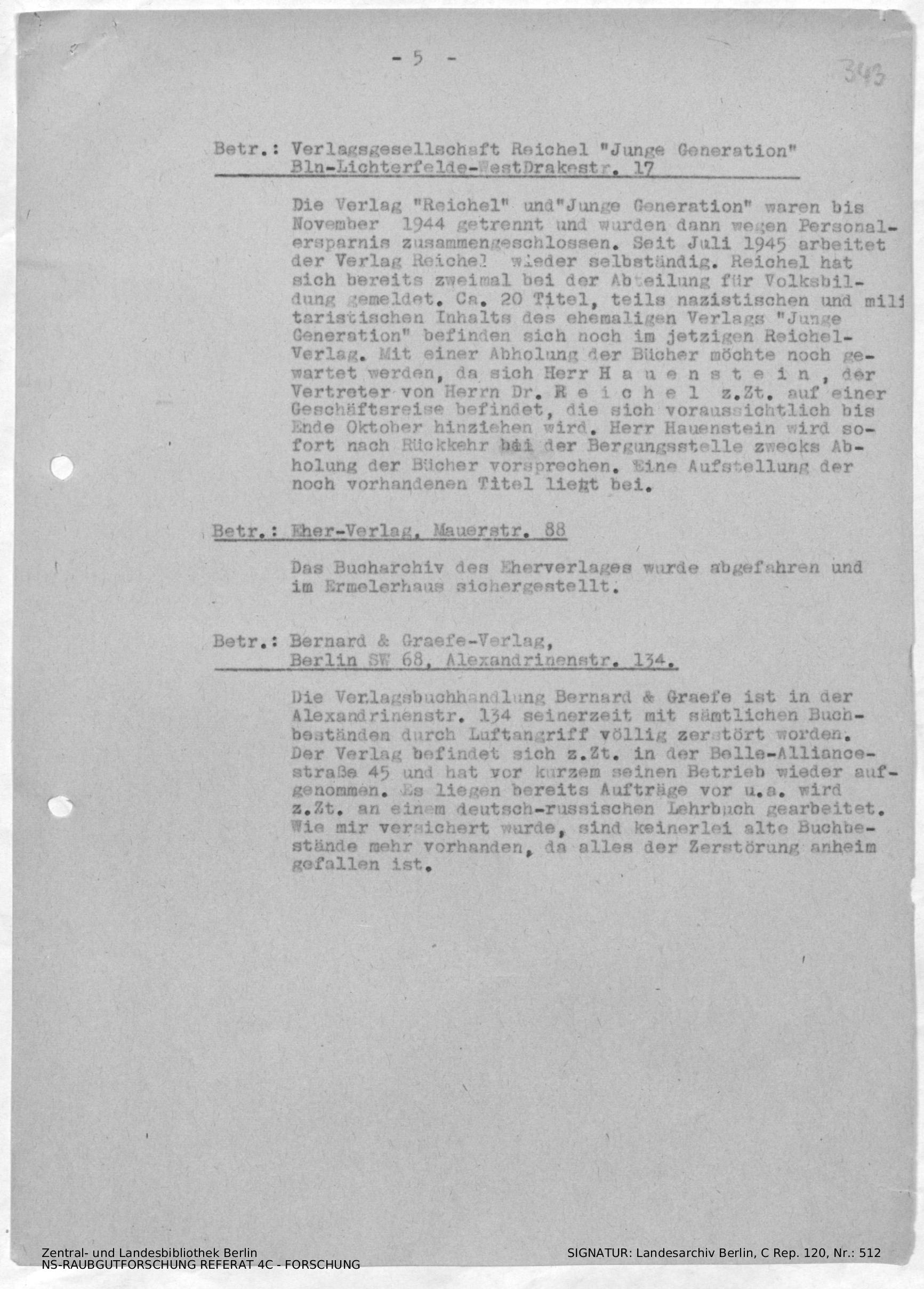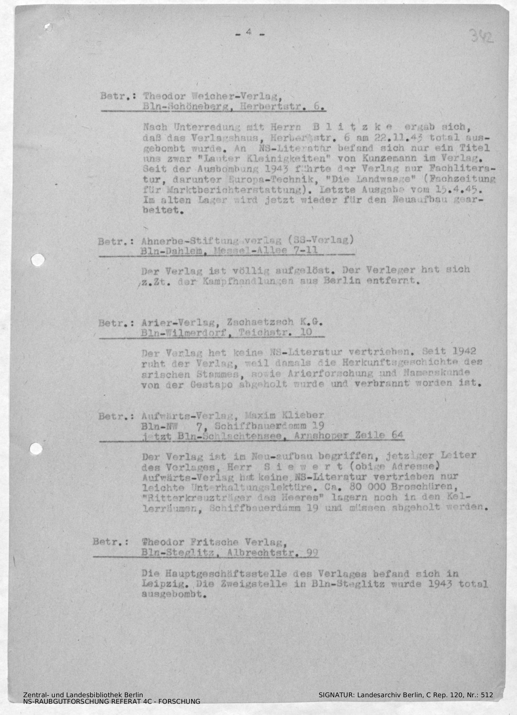 Übergabe einer Liste von Berliner Verlagen, die "vorwiegend NS- und militärisches Schrifttum herausgegeben haben". Kurzberichte der Bergungstelle nach Erkundung der Verlage.