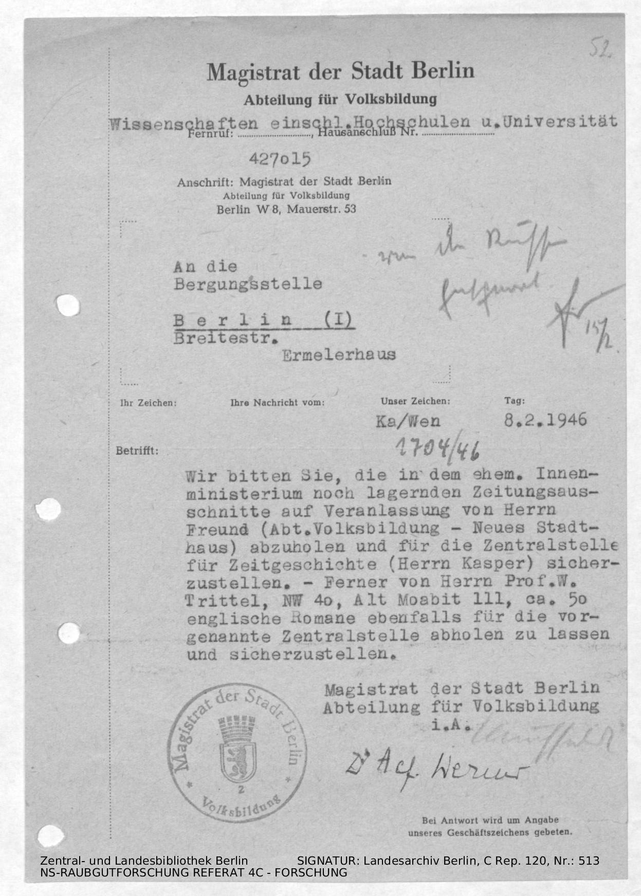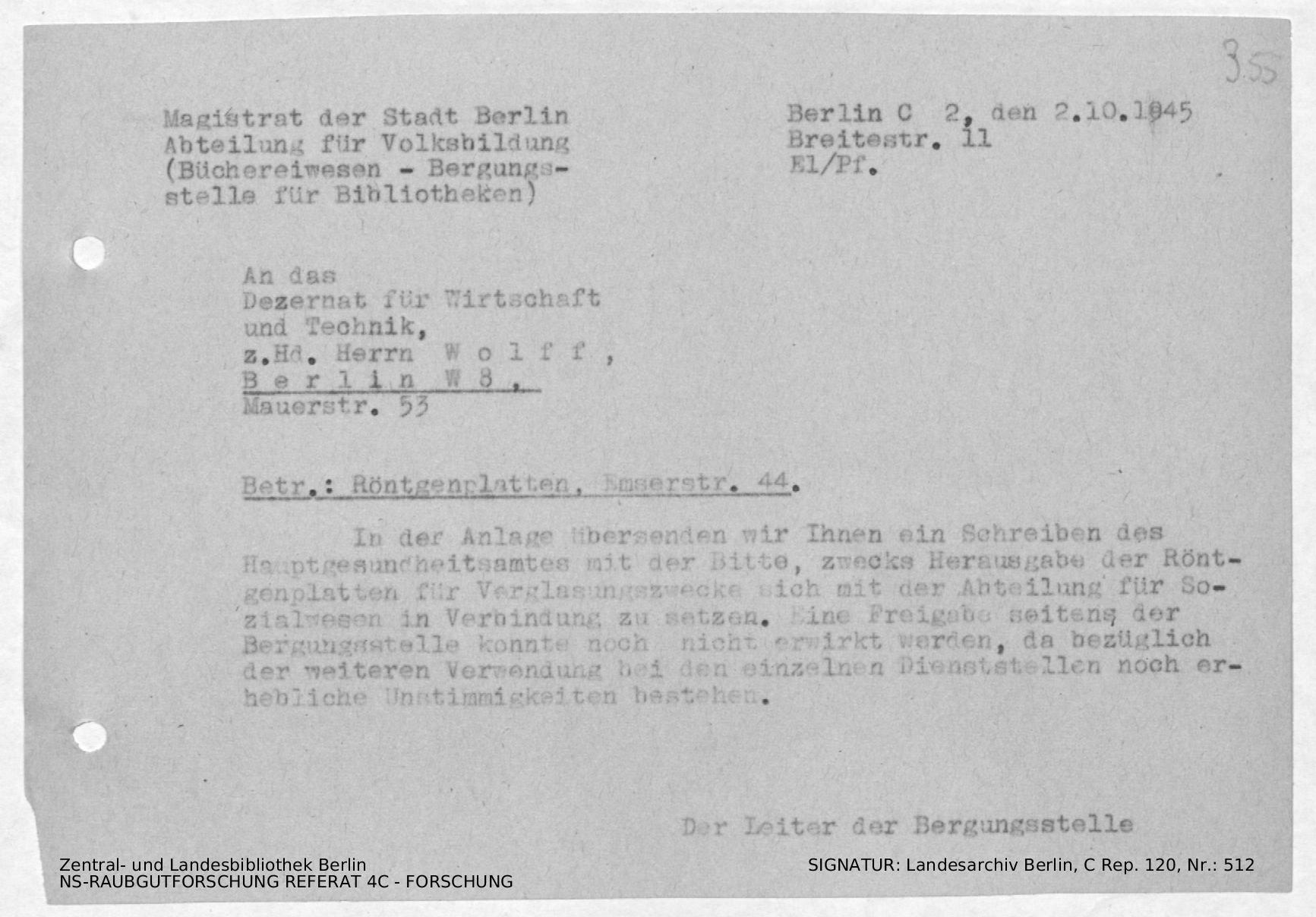 Hinweis, dass Dr. Zettler aus seiner Wohnung 5000 Blätter dem Magistrat zur Verfügung stellt. Abtransport am 6.10.1945. Interesse an Material bei Abteilung Bauwesen, Prof. Scharoun.