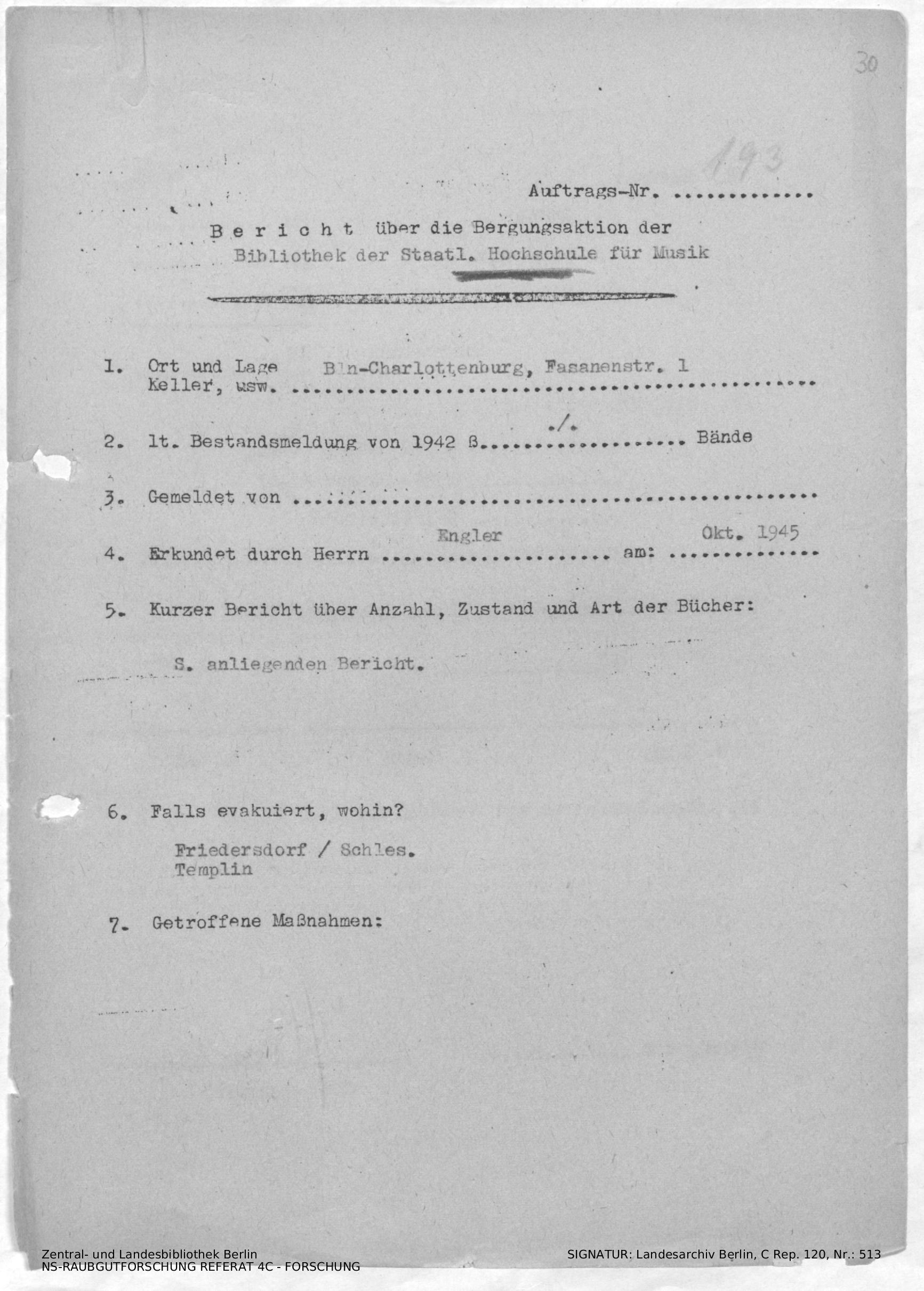 Bericht über die Bergungsaktion der Bibliothek der Staatlichen Hochschule für Musik