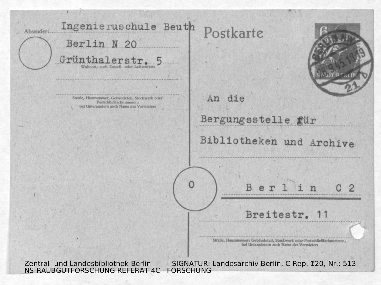 Schriftwechsel zu Beständen der Bibliothek der Ingenieurschule Beuth