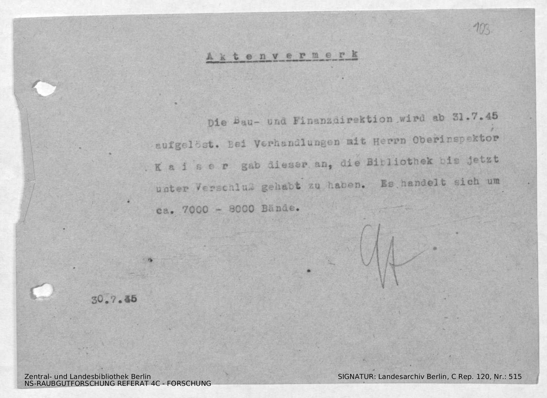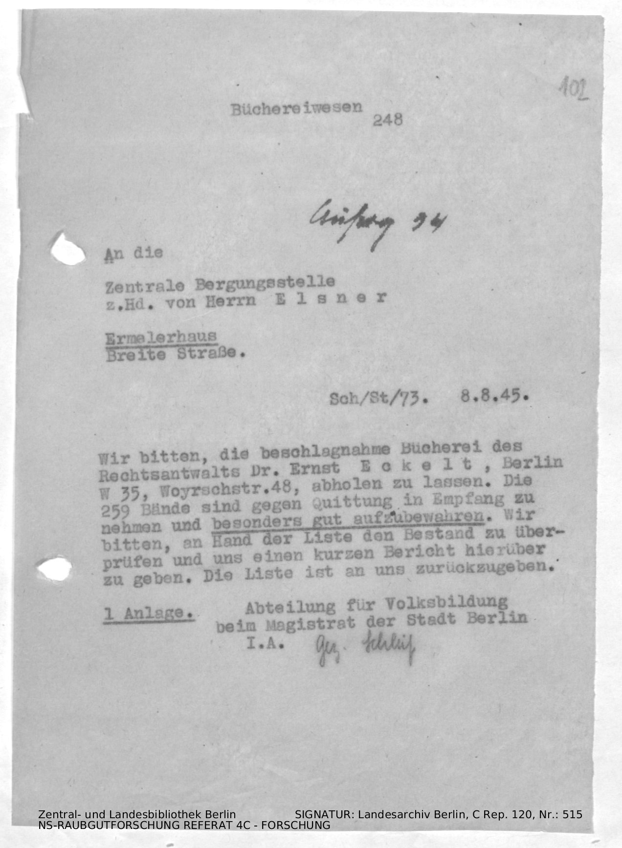 Hinweise zu sichergestellten Bibliotheken aus Parochialstr. 1-3, von Dr. Ernst Eckelt sowei der Bau- und Finanzdirektion