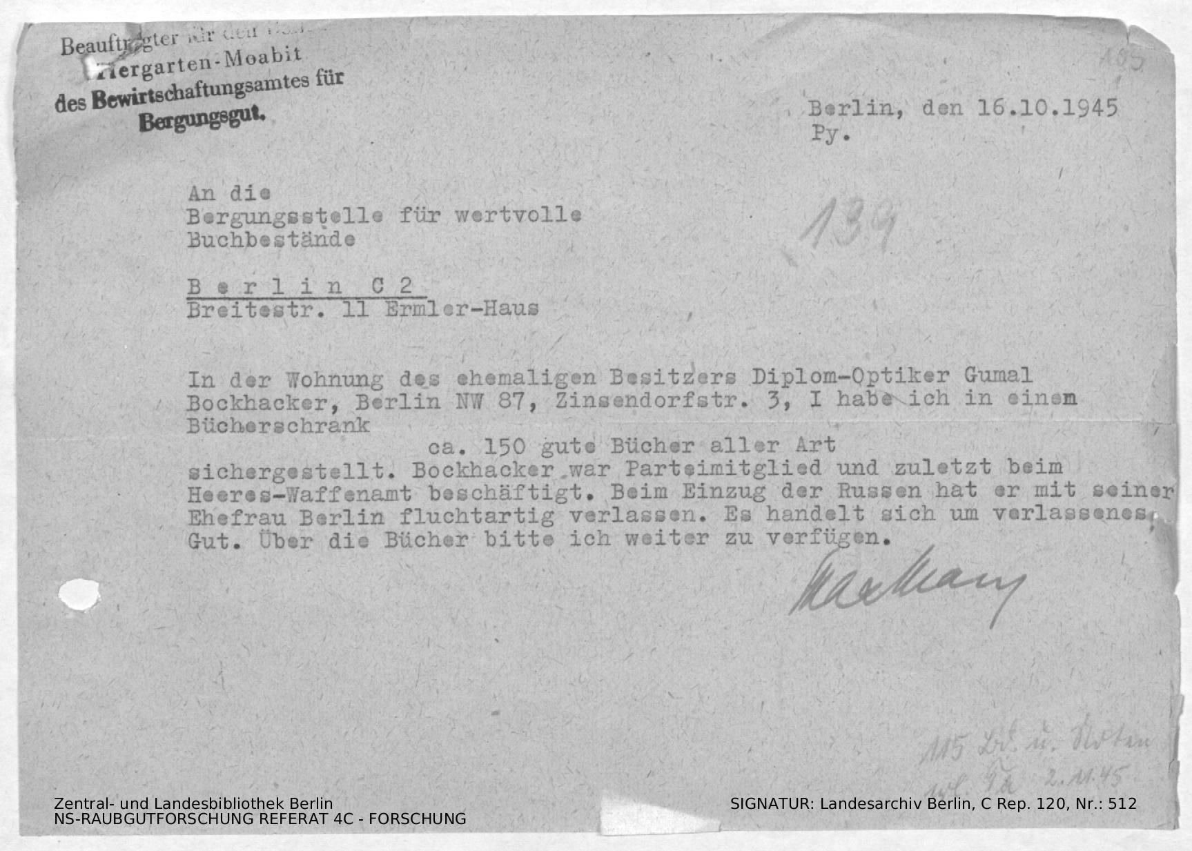 Hinweise zur Person und der Sicherstellung von 150 Büchern aller Art.