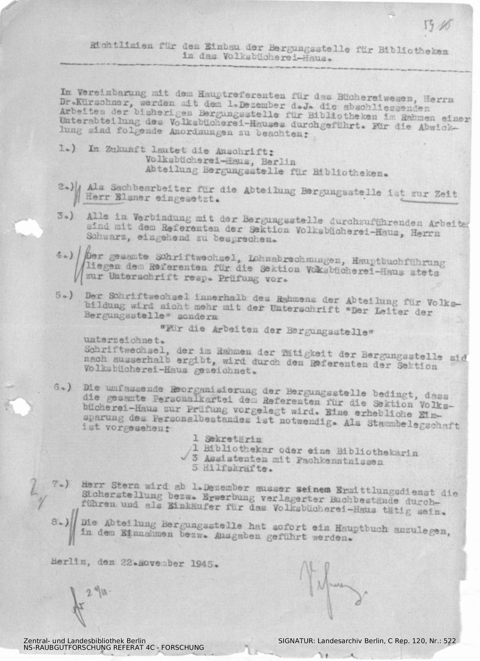 Richtlinien für den Einbau der Bergungstelle für Bibliotheken in das Volksbücherei-Haus