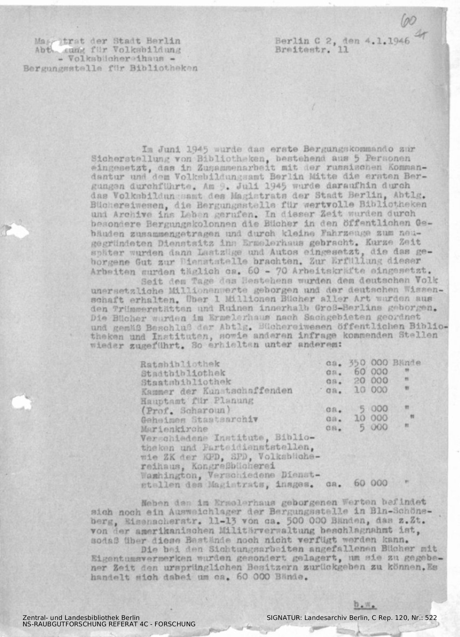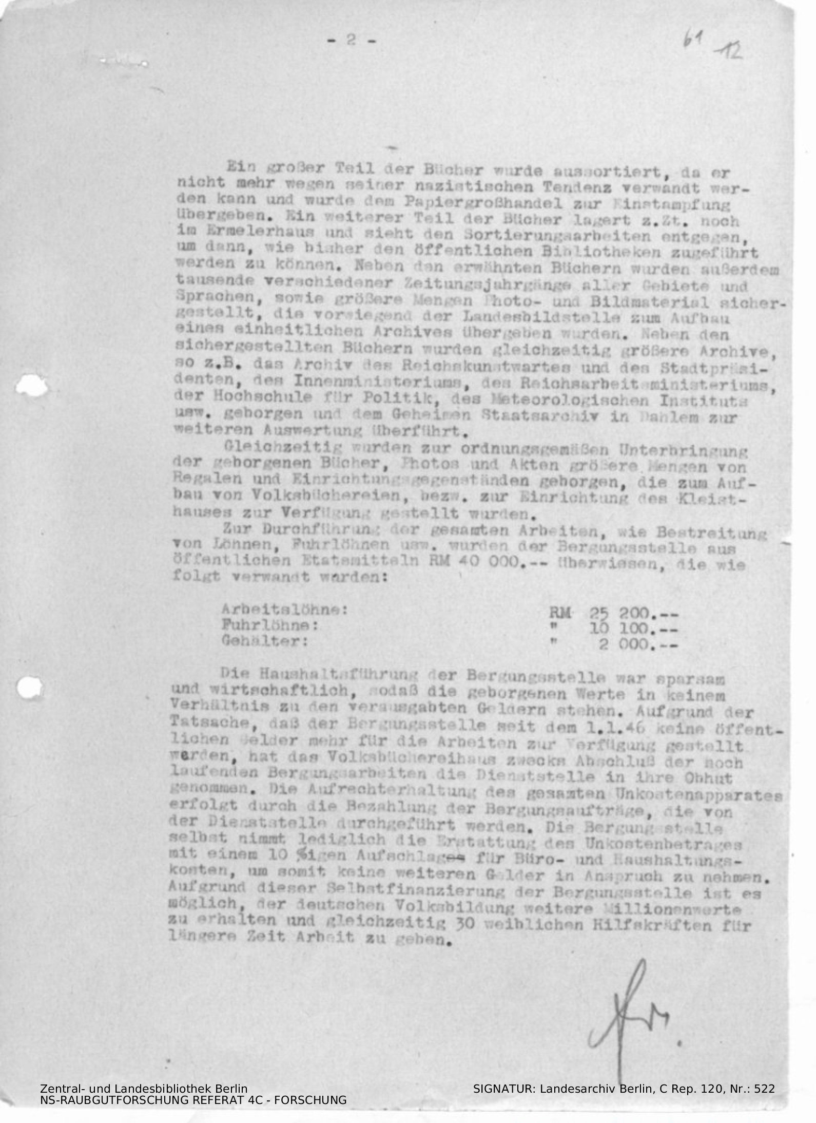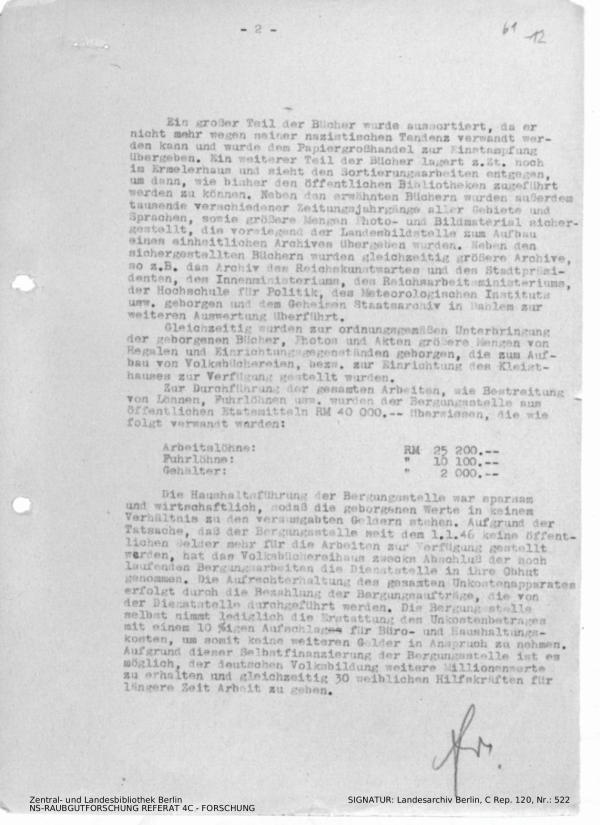 Angaben zur Organisation, Verteilung und sichergstellten Anzahl von Bänden sowie Kosten.