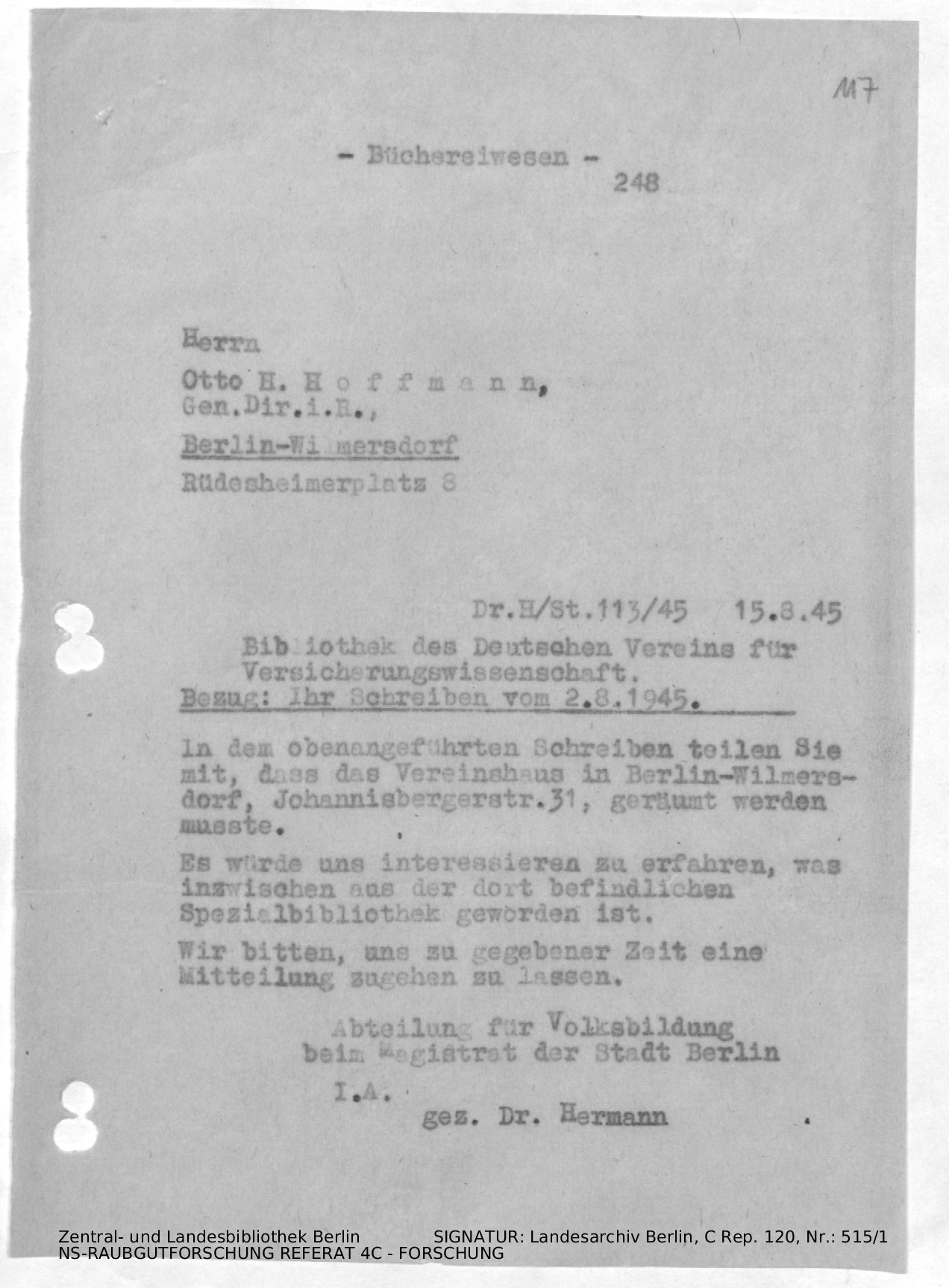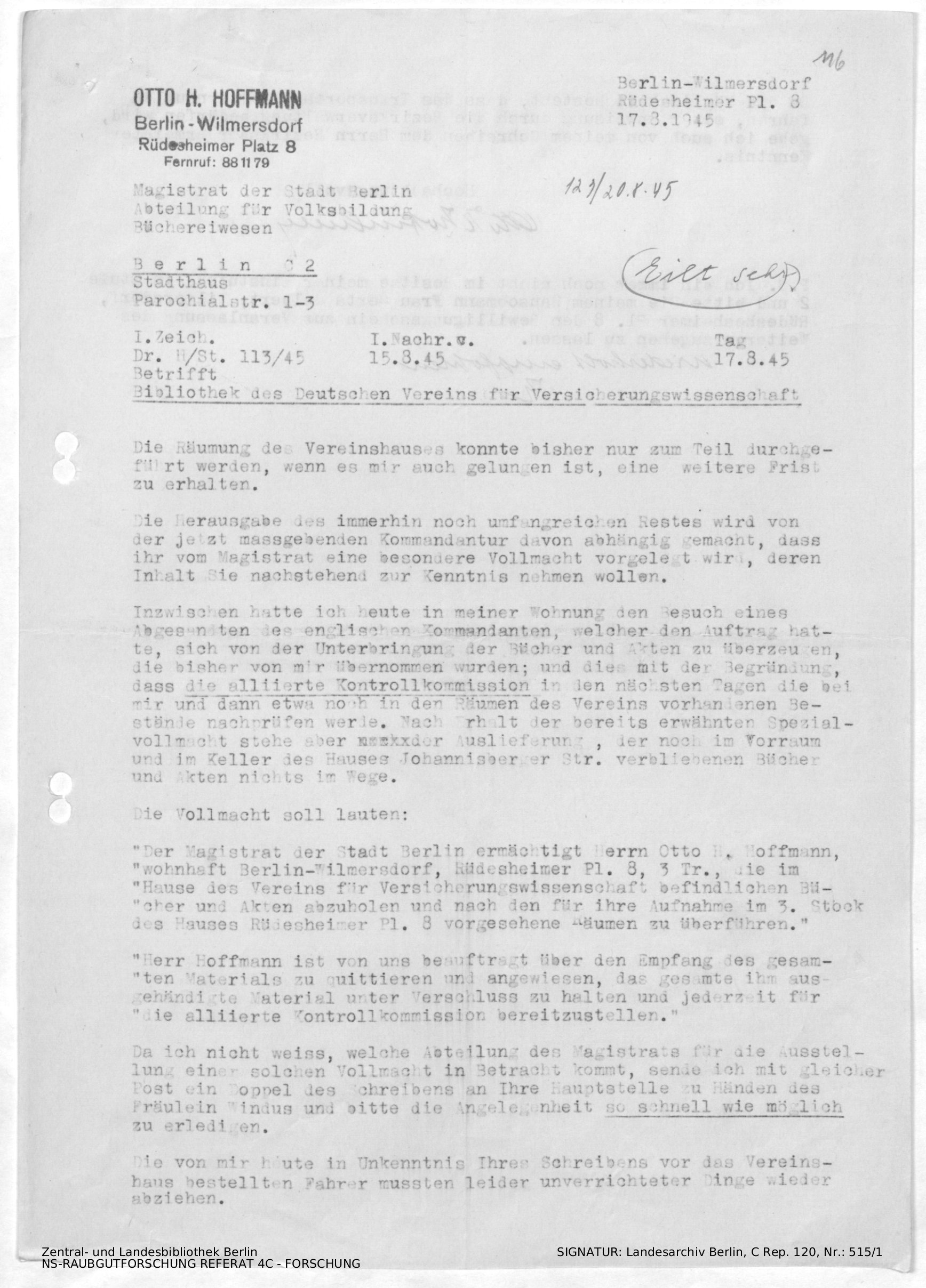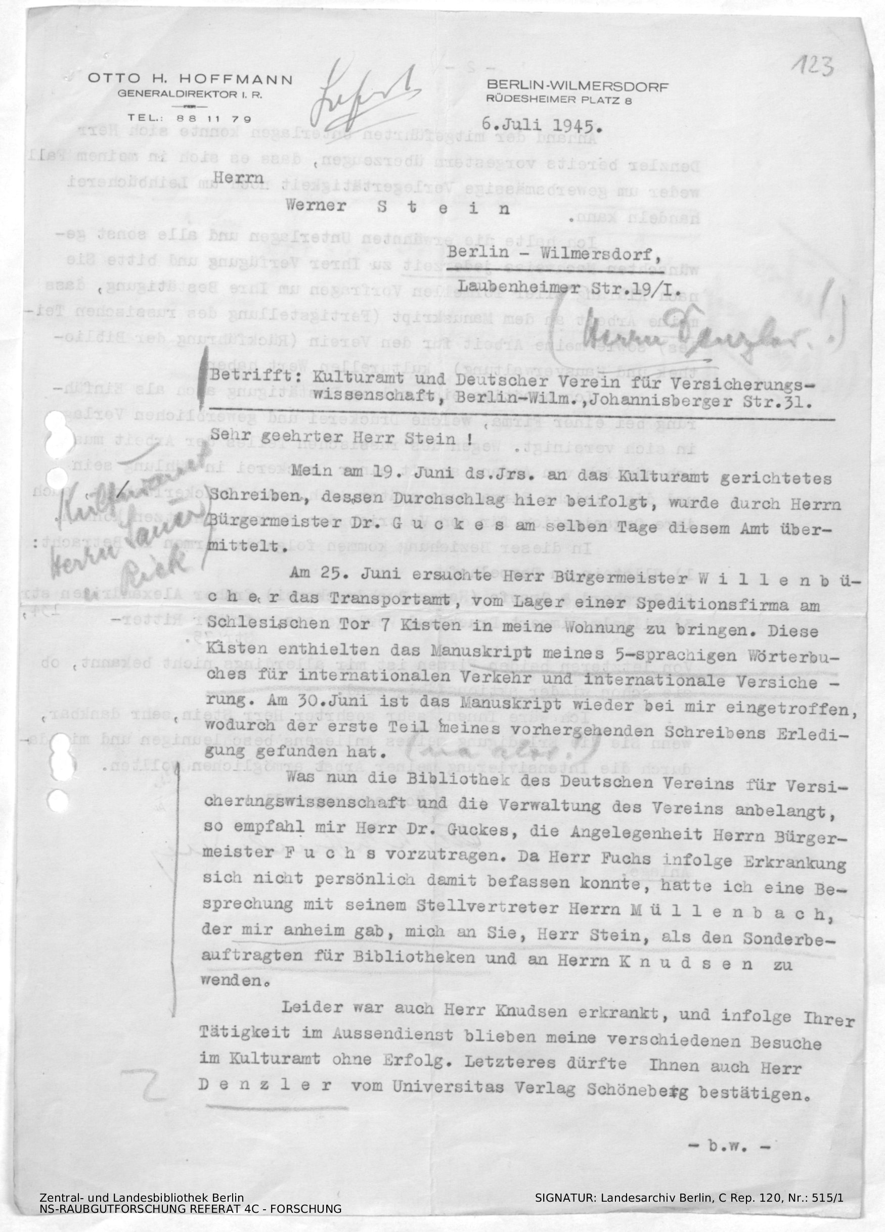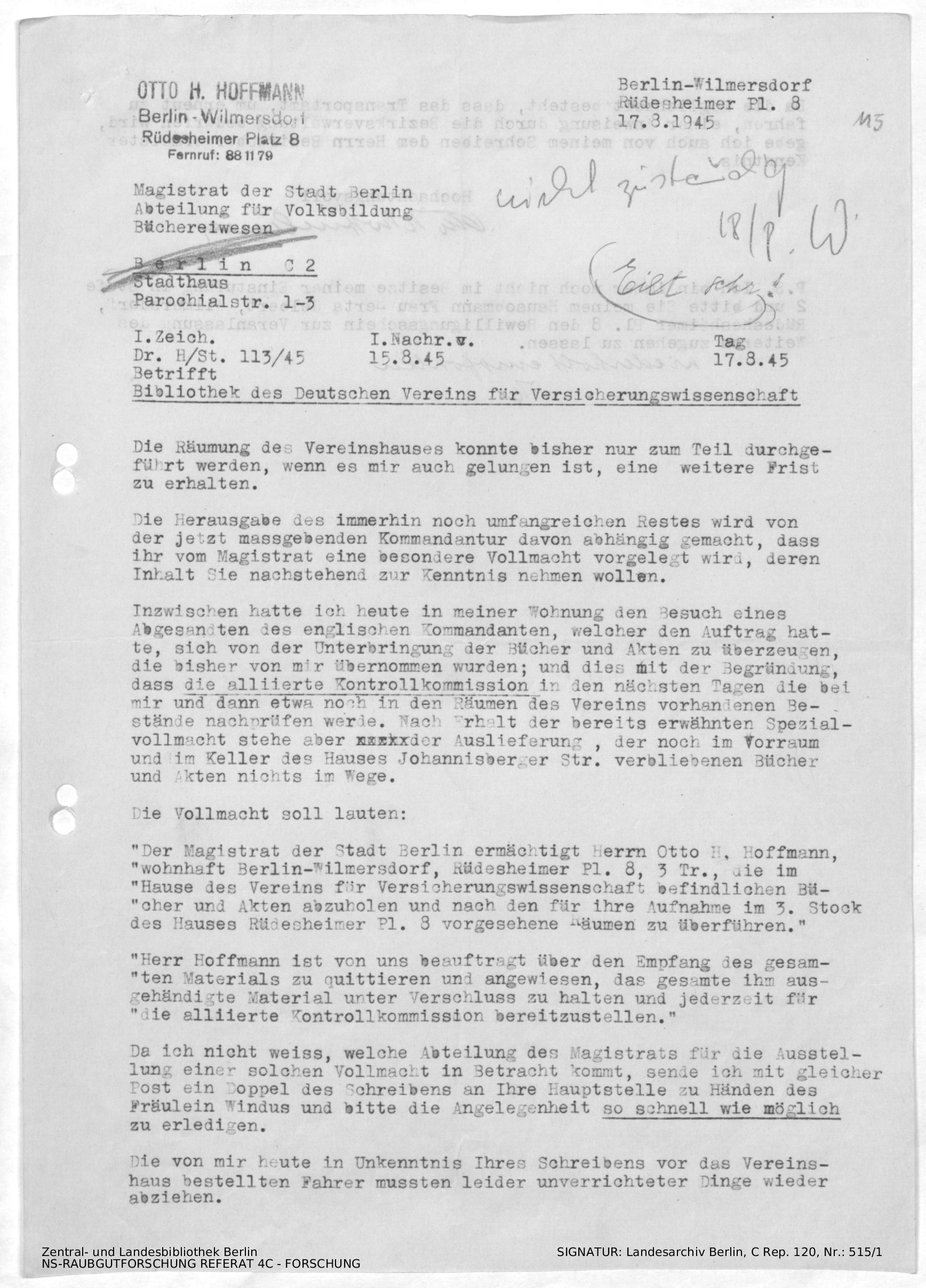Schriftwechsel zu Beständen des Deutschen Vereins für Versicherungswissenschaft