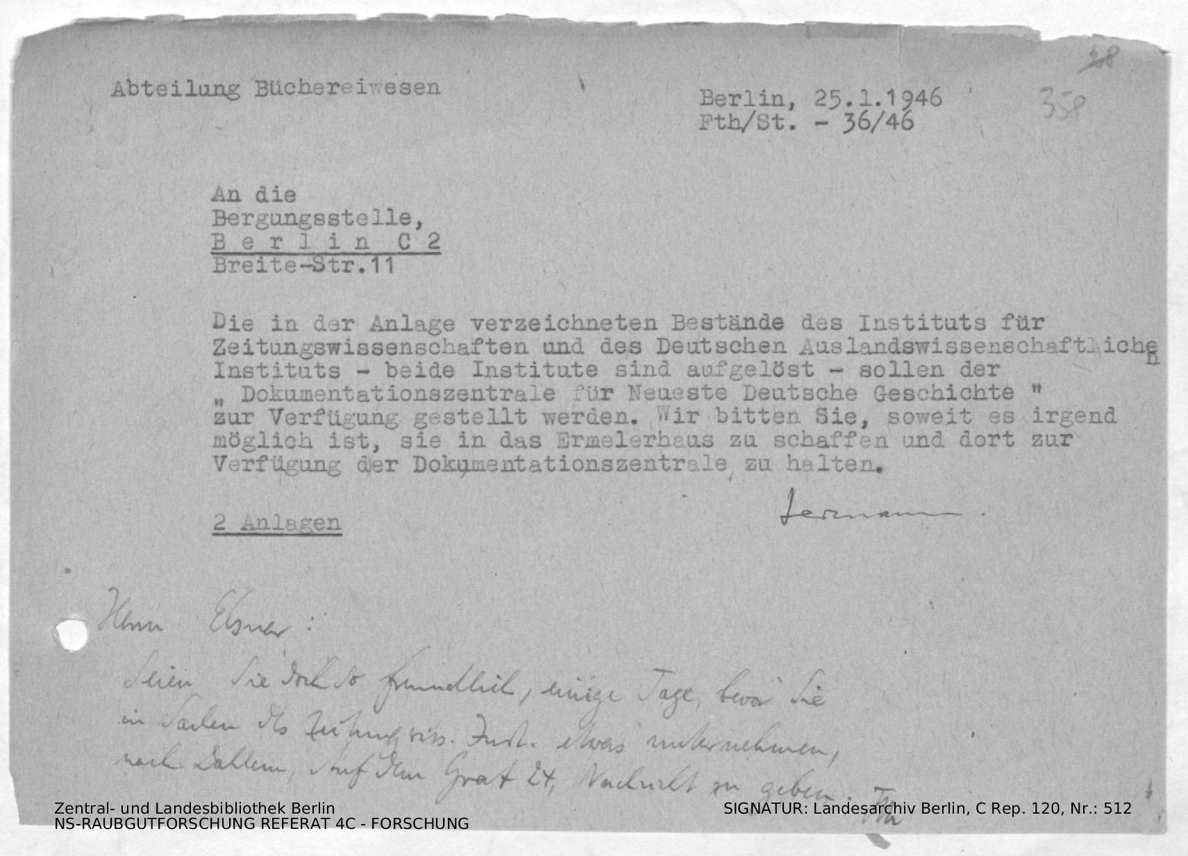 Rundbrief an Bibliotheken mit Bitte um Rückgabe von Privatbibliotheken