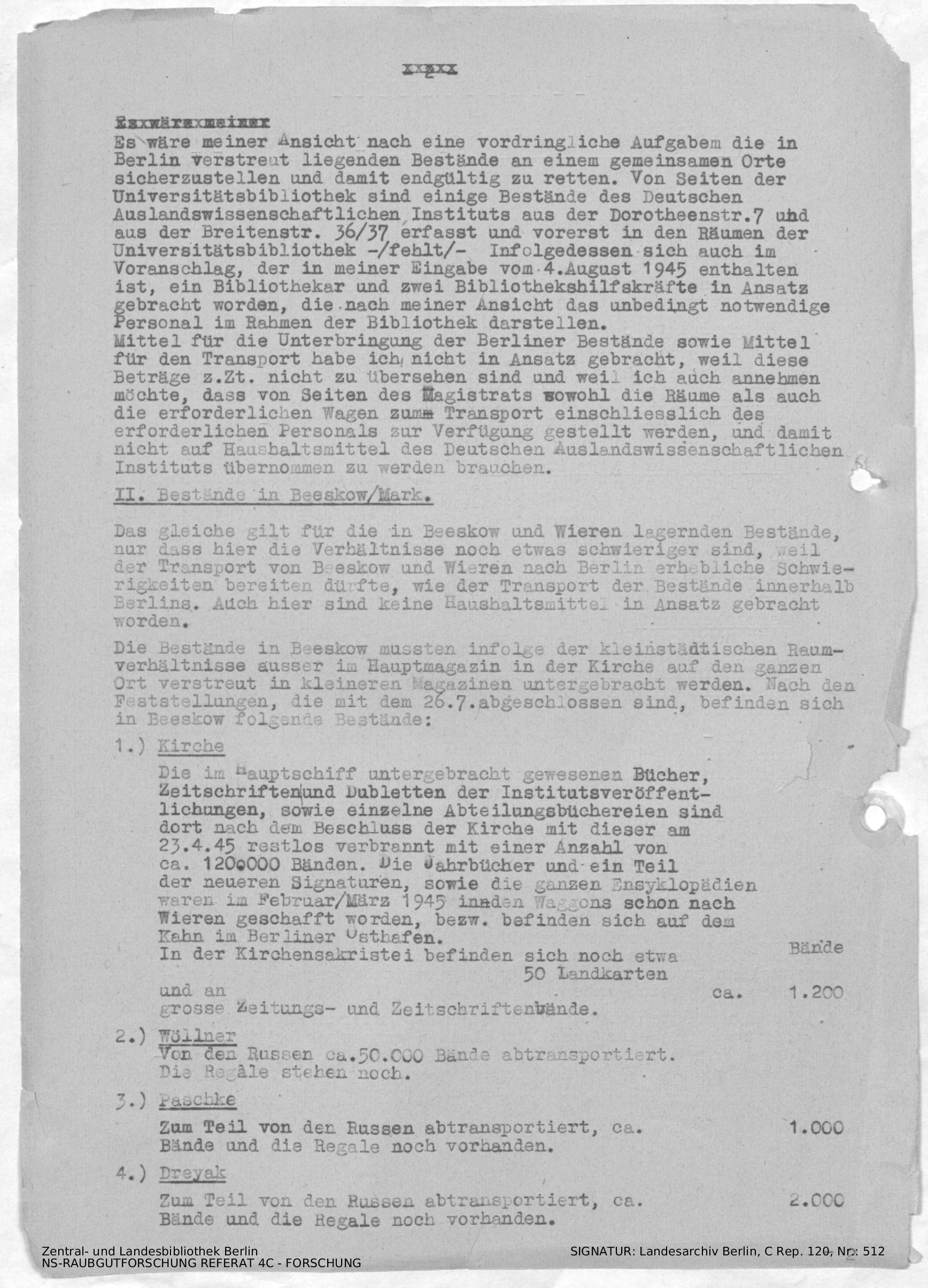 Bestände sollen der "Dokumentationszentrale für neueste Deutsche Geschichte" zur Verfügung gestellt werden. Bericht zur Auslagerung und Verteilung der Bestände.