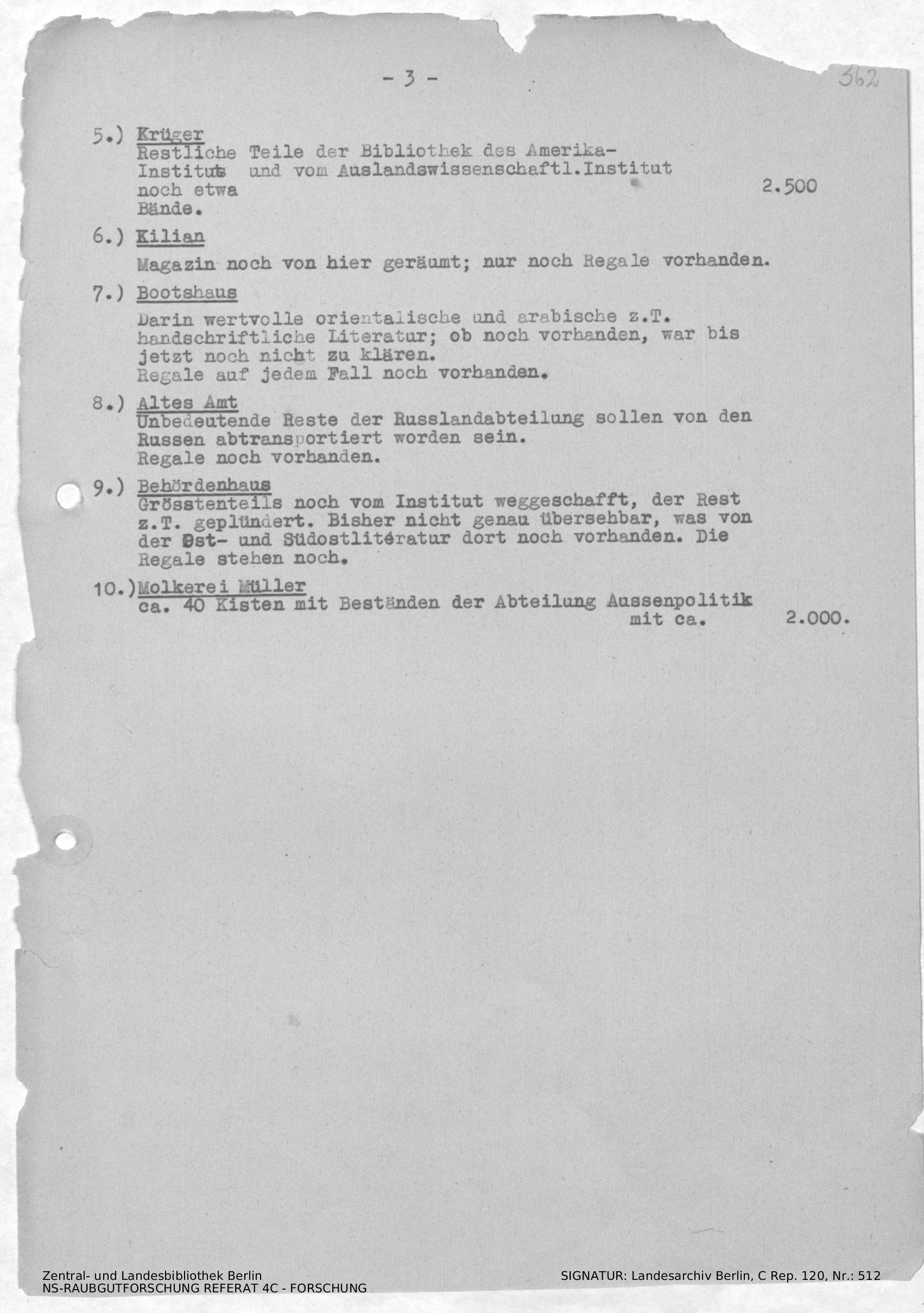 Rundbrief an Ratsbibliothek, Stadtbibliothek und Staatsbibliothek über Falschmeldungen von Privatbibliotheken mit den Nummern 81 (Dr. Gra[e]ntz) und Nummer 123 (Archeologe Kurt Lange)